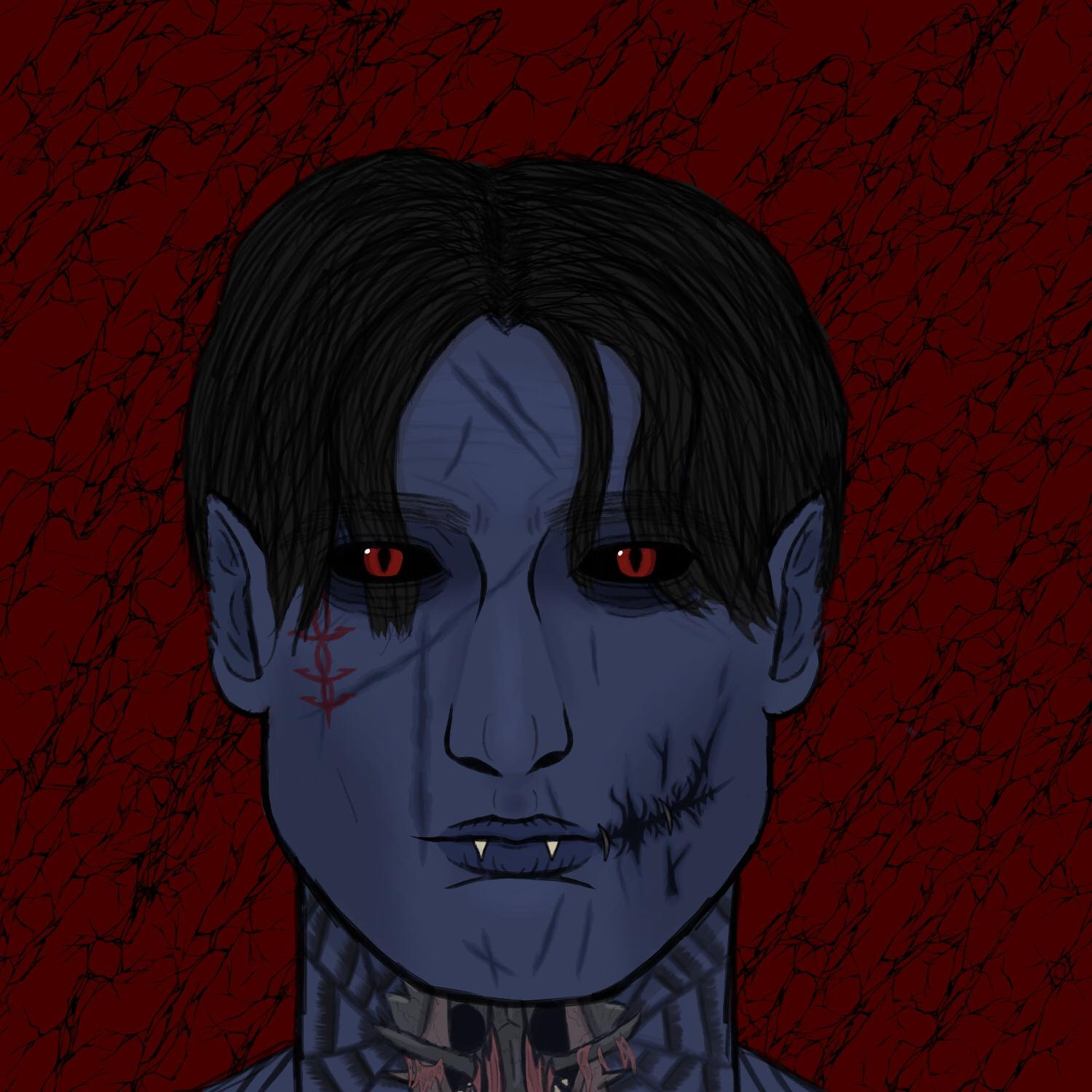 x Various patches of rotten dark tissue and muscle litter his physique, including a patch spanning his left cheek that is held together by iron rings.
